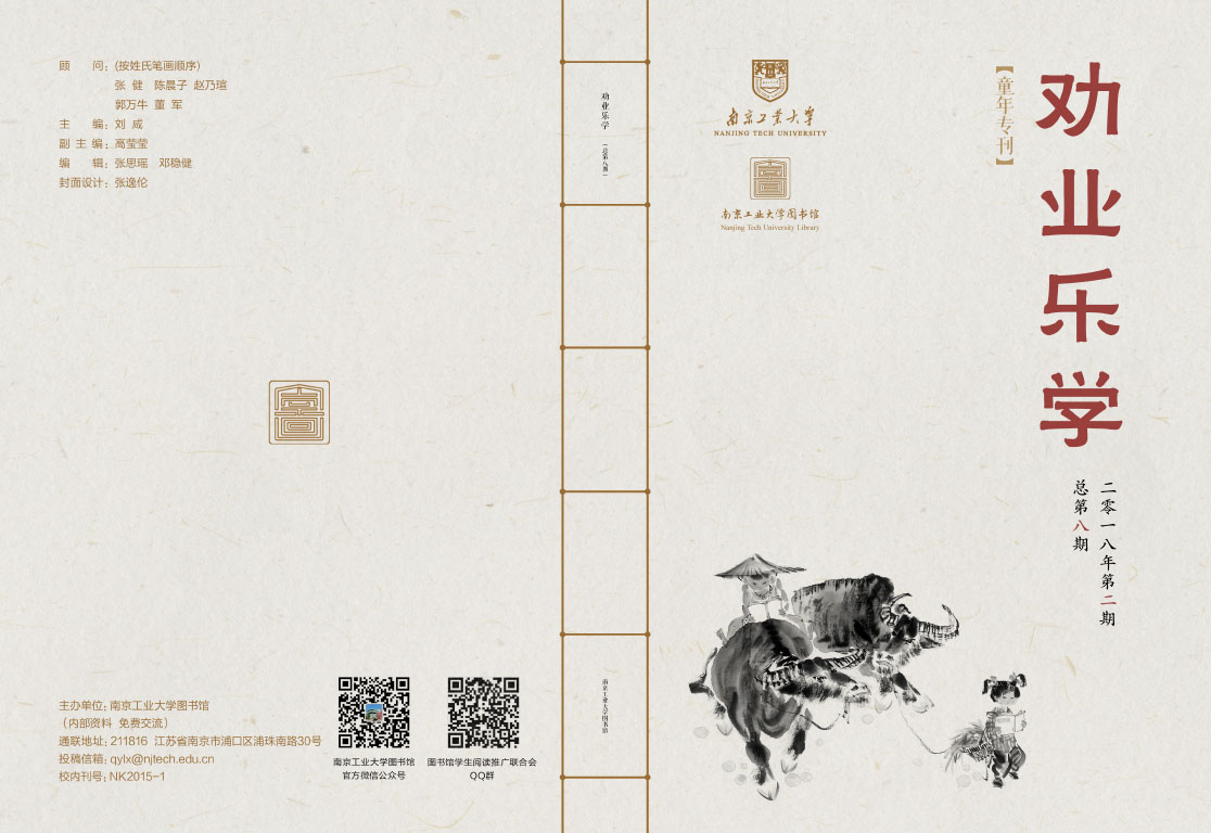 为贯彻党中央开展“全民阅读”的部署,贯彻校领导着力构建文化引领体系的战略,响应黄维校长“以书立学、以学立身”的倡导,巩固和发展我校阅读推广已取得的丰硕成果,在宣传部的指导下,在校团委和教学事务部的支持下,图书馆主办的校园阅读刊物《劝业乐学》于2015年4月23日问世。