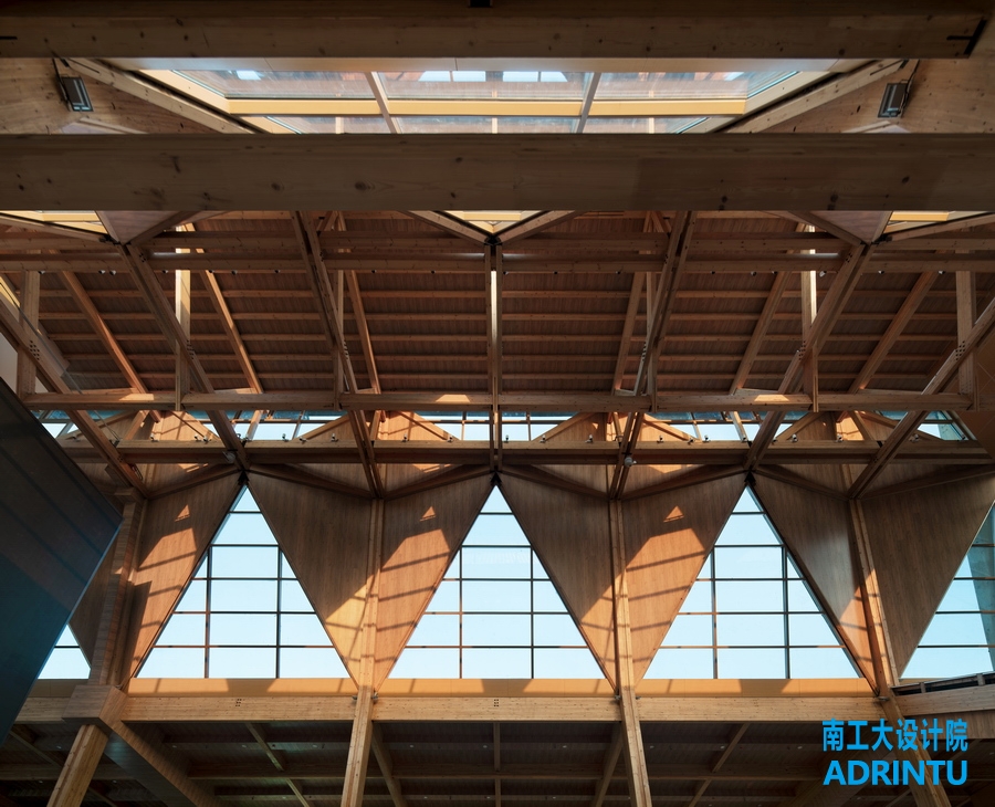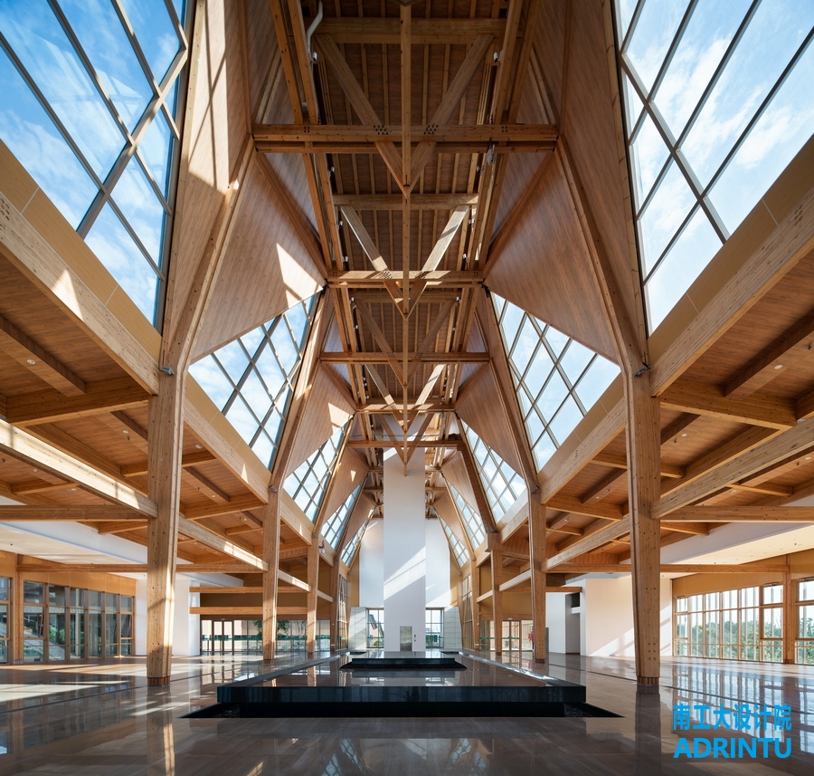 主展馆主体采用现代木结构,并用明晰的架构将出檐深远、铺作宏大的古代木构特征转译于建筑,减除了繁密的支柱,形成恢弘的空间。另一方面借助模数系统规整不同尺度用材,统筹大、小木作,统筹设备空间,最大程度简化装修,展现了结构的自然之美。