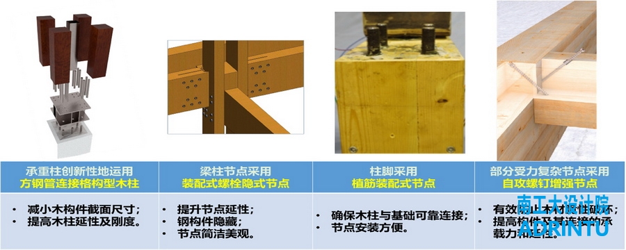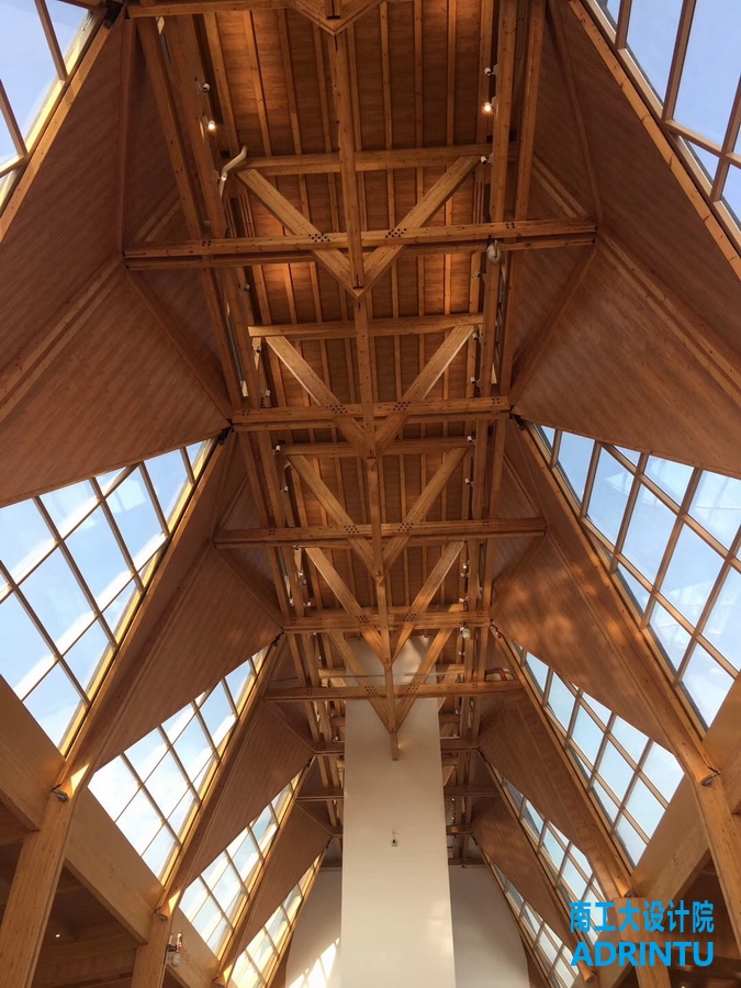 主展馆木结构建筑应用了桁架顶接异形刚架结构体系、交叉内凹支撑纵向抗侧结构体系、张弦交叉木梁大跨屋盖、格构型木柱抗火设计、X射线装配式节点质量检测、自攻螺钉增强节点等多项创新技术,其中相关技术曾获江苏省科学技术奖一等奖、华夏建设科学技术奖二等奖、高等学校九游会真假优秀成果奖(科学技术)二等奖等奖项,展现了绿色建筑的最新技术和优势,体现了现代木结构技术与传统建筑文化的融合创新,达到了国际先进、国内领先的水平。